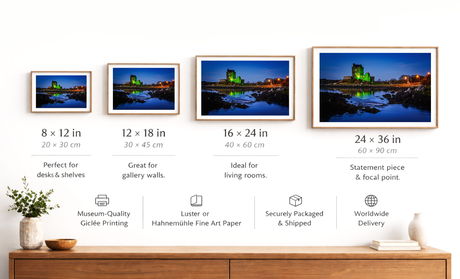 Smaller prints work well for shelves and gallery walls, while larger formats create a stronger visual impact.
